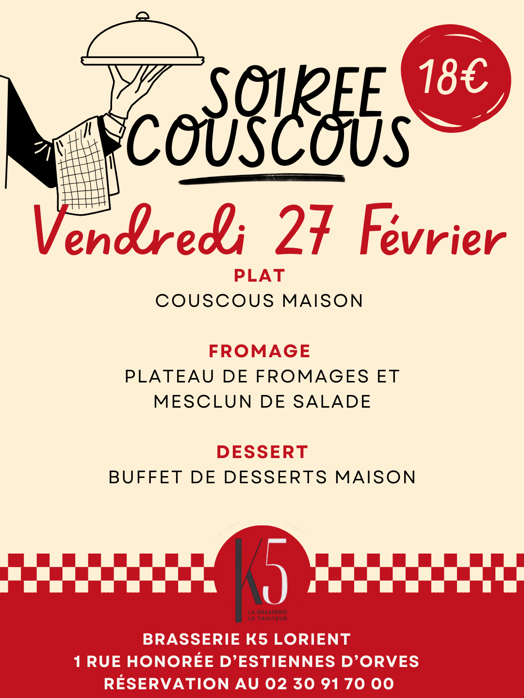 Repas au restaurant avec service en buffet, profitez de notre couscous maison, plateaux de fromages et dessert au choix pour seulement 18 €/ repas ! Boissons à la carte et possibilité de danser sur notre playlist selon l'ambiance de la salle ...